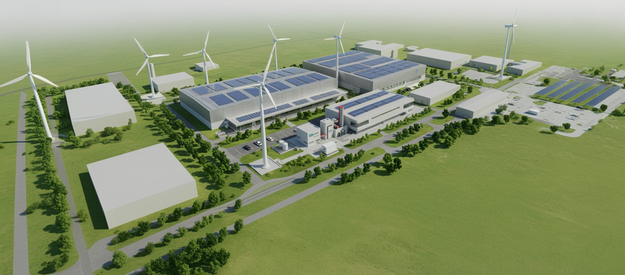 Die autarke Energieversorgung spielt eine entscheidende Rolle am gesamten Standort und wird in die Planung von erster Minute an mitintegriert. Zusätzlich zu der geplanten Effizienz fördert das Energiekonzept nachhaltige Praktiken als Leitbild für zukunftausgerichtete Produktionsstätten und lokal produzierende Energiegewinnung, und reduziert damit drastisch die Abhängigkeit von fossilen Brennstoffen. An unserem Standort sorgen daher drei Windkrafträder zusammen mit großzügigen 20.000 m² Photovoltaikanlagen für eine grüne und konstante Energieversorgung, die in harmonischer Symbiose mit der geamten Umgebung stehen. Sie ermöglicht uns, die Energie, die wir zur Verarbeitung von recycelbaren Materialien am Standort benötigen, vollständig selbst zu erzeugen.